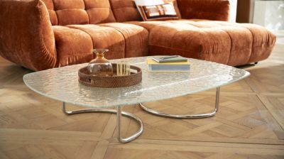 Piétement tube d’acier inoxydable poli, plateau verre martelé ...